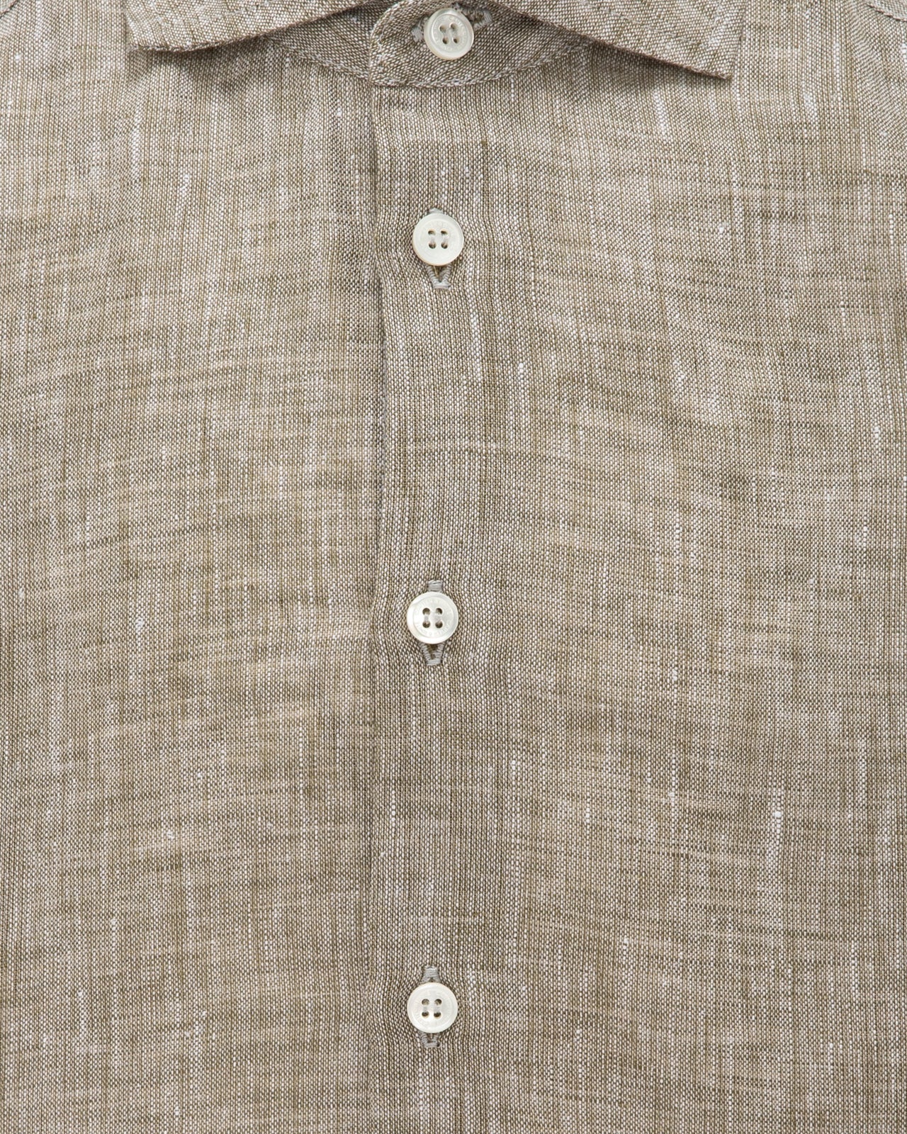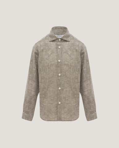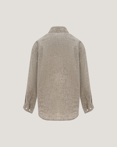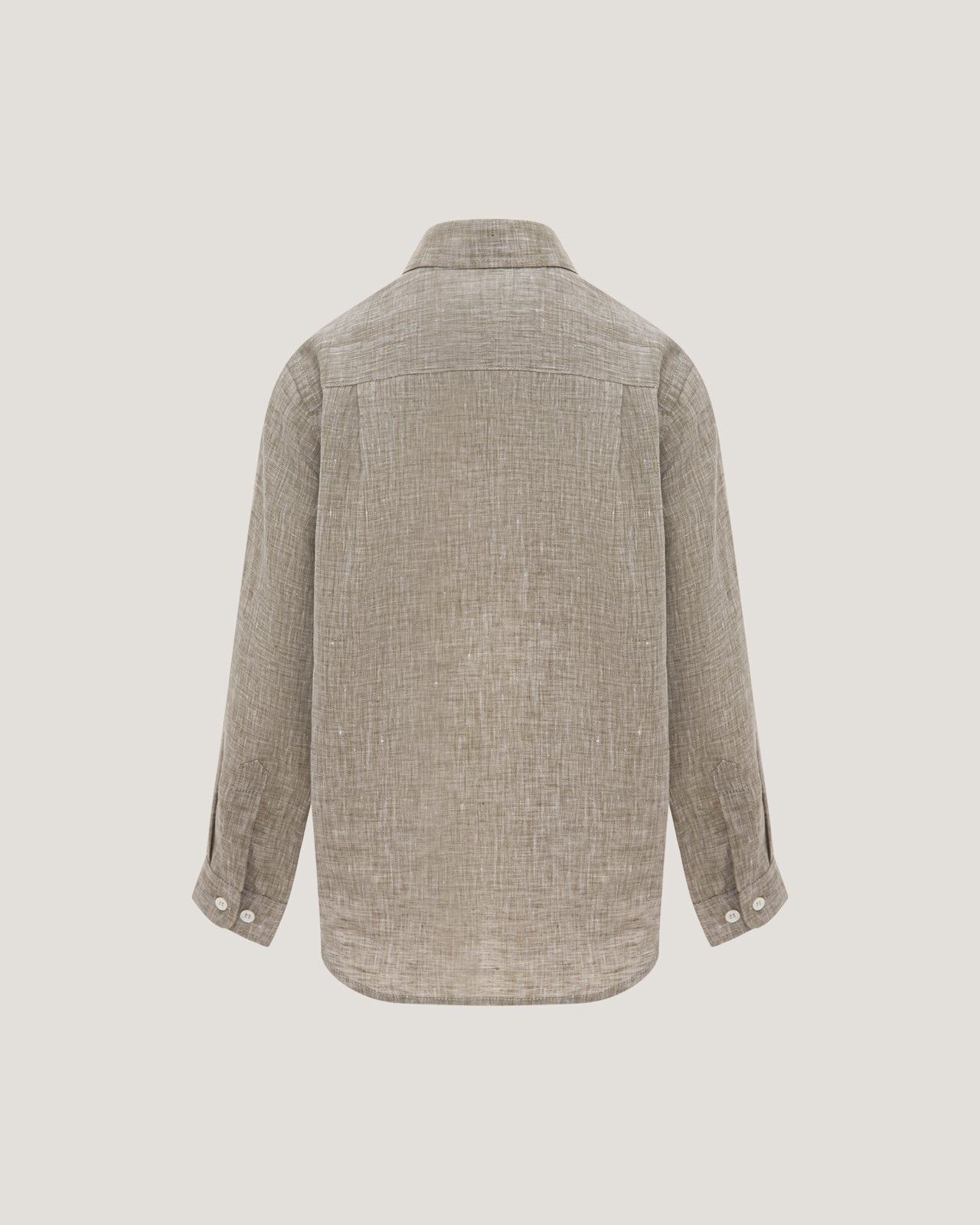 The shirt features a clean, tailored silhouette with a classic collar and refined button-down front, finished with natural buttons for a polished touch. Rendered in a soft, neutral tone, the subtly textured fabric highlights the beauty of linen’s natural weave, lending quiet sophistication to a versatile piece.