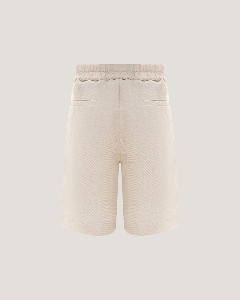 Thoughtfully designed with two slanted front pockets and two welt pockets at the back, these shorts offer practical storage without compromising on elegance. The front closure with a zipper and button completes the look, making these shorts a versatile staple for any occasion.