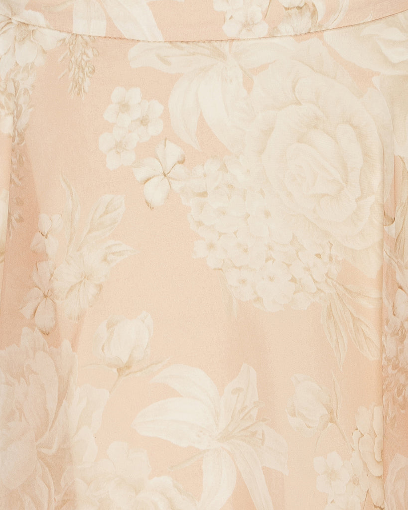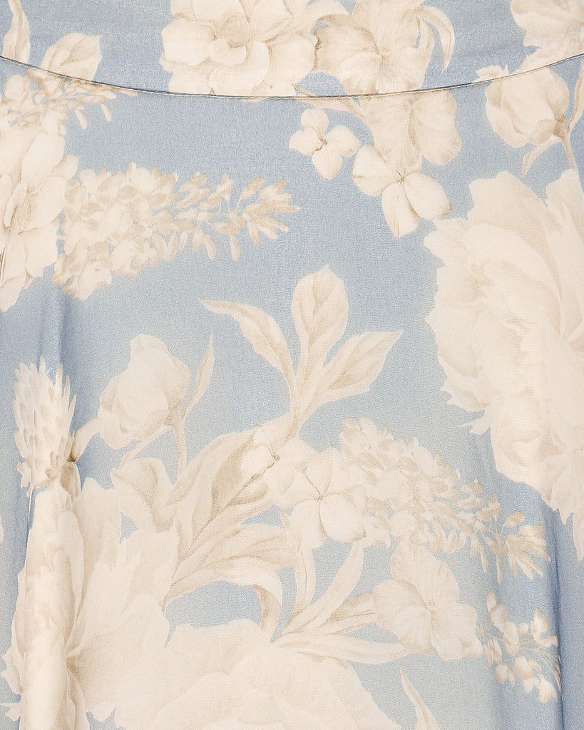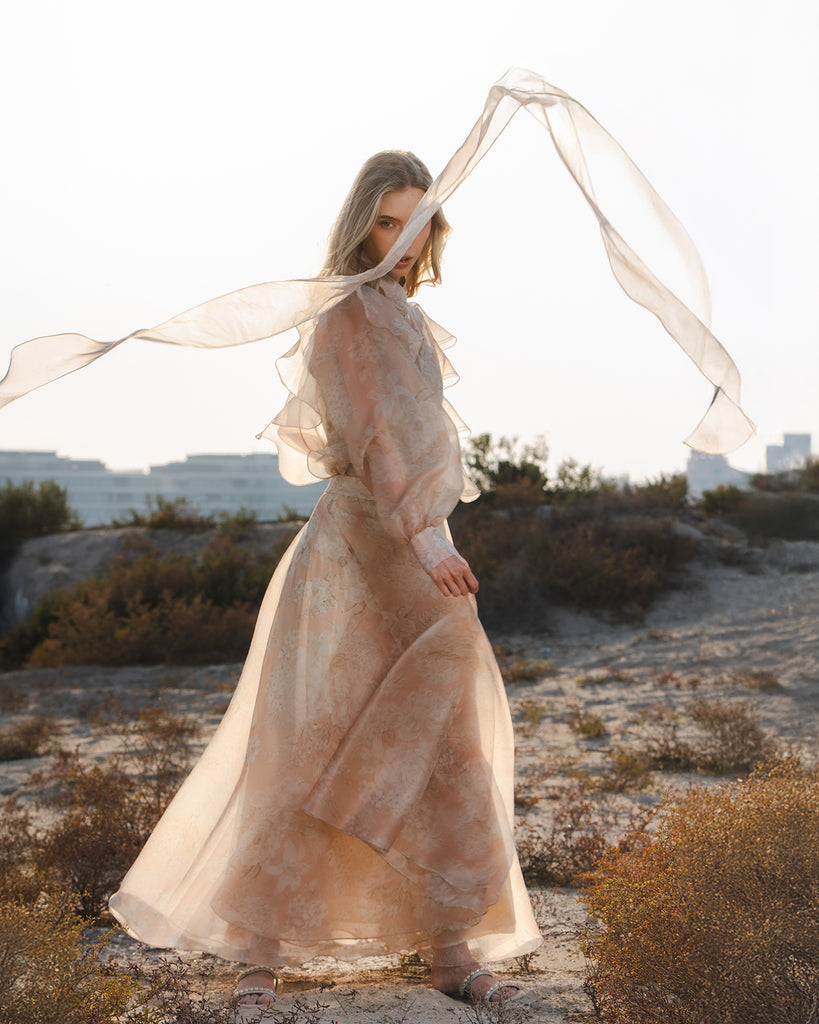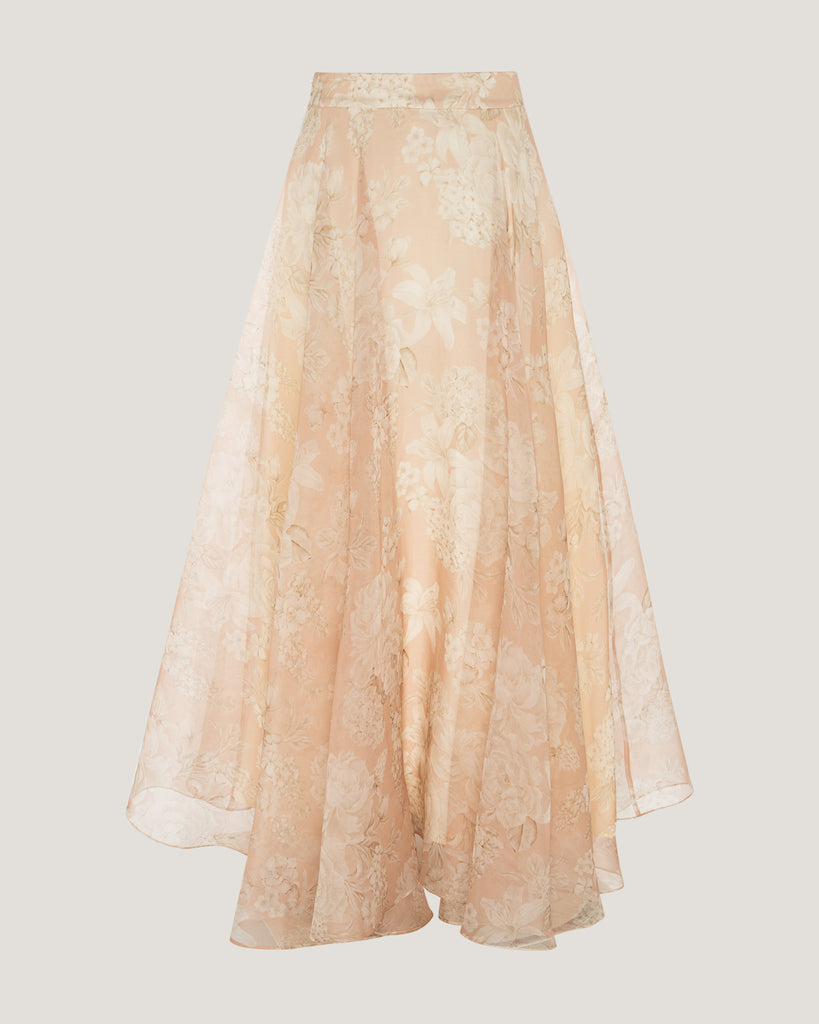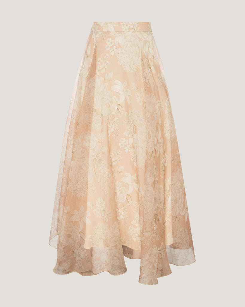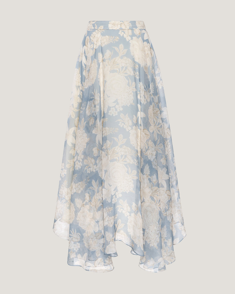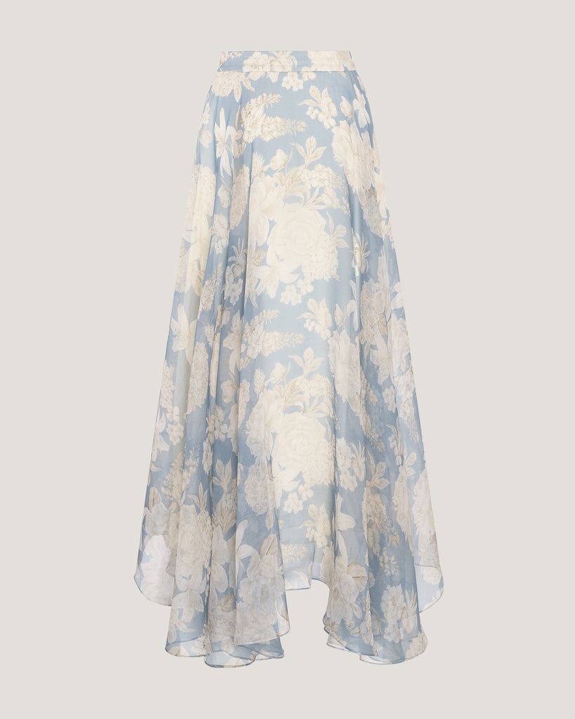 Light as air and impeccably composed, the Alaia skirt is crafted from the same sheer floral silk organza as the Ayah blouse, creating a harmonious ensemble. The waist is delicately defined, while the flared cut brings fluidity and movement to each step. Fully lined for modesty, it preserves the diaphanous charm of the fabric while offering effortless wearability. With every motion, the skirt dances softly in the breeze — a celebration of elegance in its most graceful form.