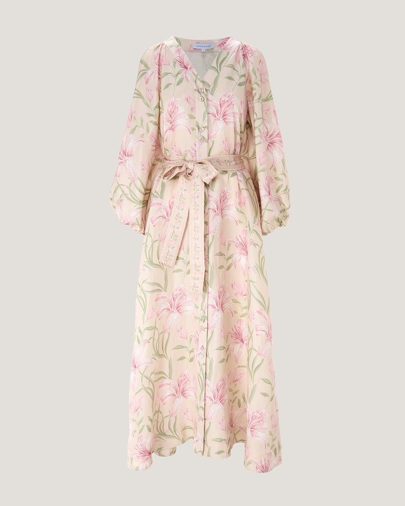 Experience timeless elegance with Women Isadora Printed Button Down V-Neck Dress. This sophisticated dress features a flattering belted waist and a flowing maxi length, perfect for creating a graceful silhouette. Crafted from high-quality fabric, it ensures durability and a polished look.