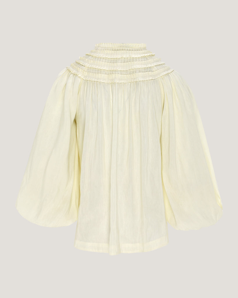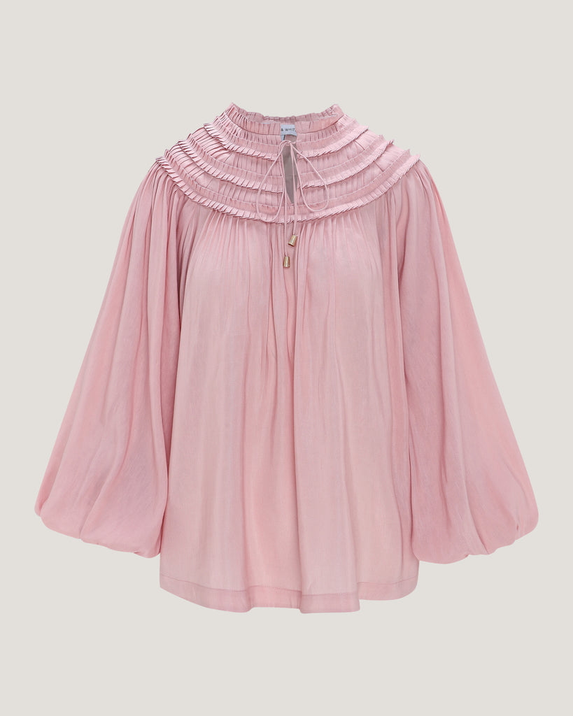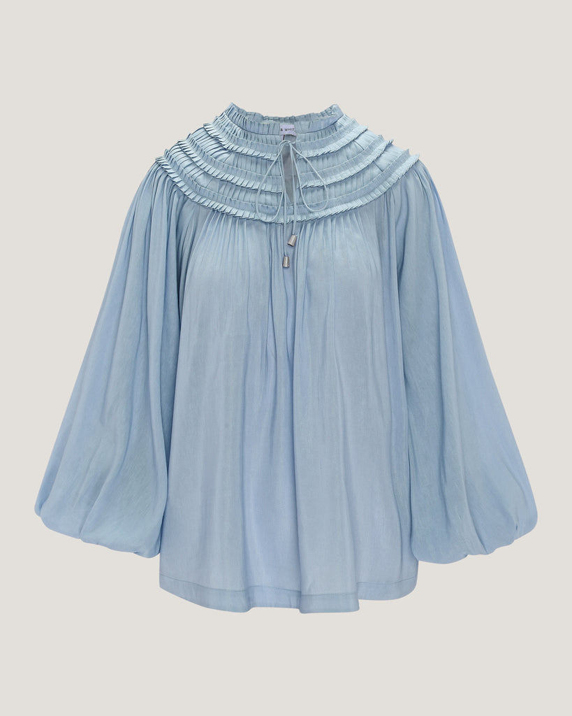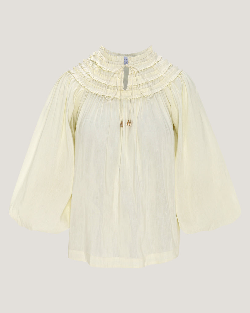 A delicate interplay of structure and softness, the Lizzie blouse captures the essence of modern femininity. The neckline, adorned with three lines of pleated ruffles, evokes a refined romance, while string loops and metal stoppers add a contemporary touch. Raglan sleeves cascade into voluminous balloon hems, lending graceful movement and subtle drama to the silhouette.