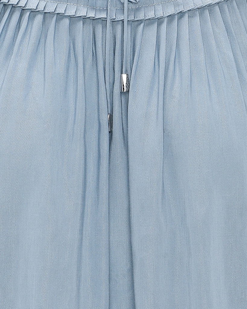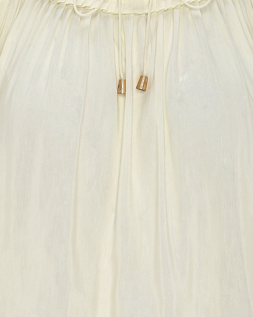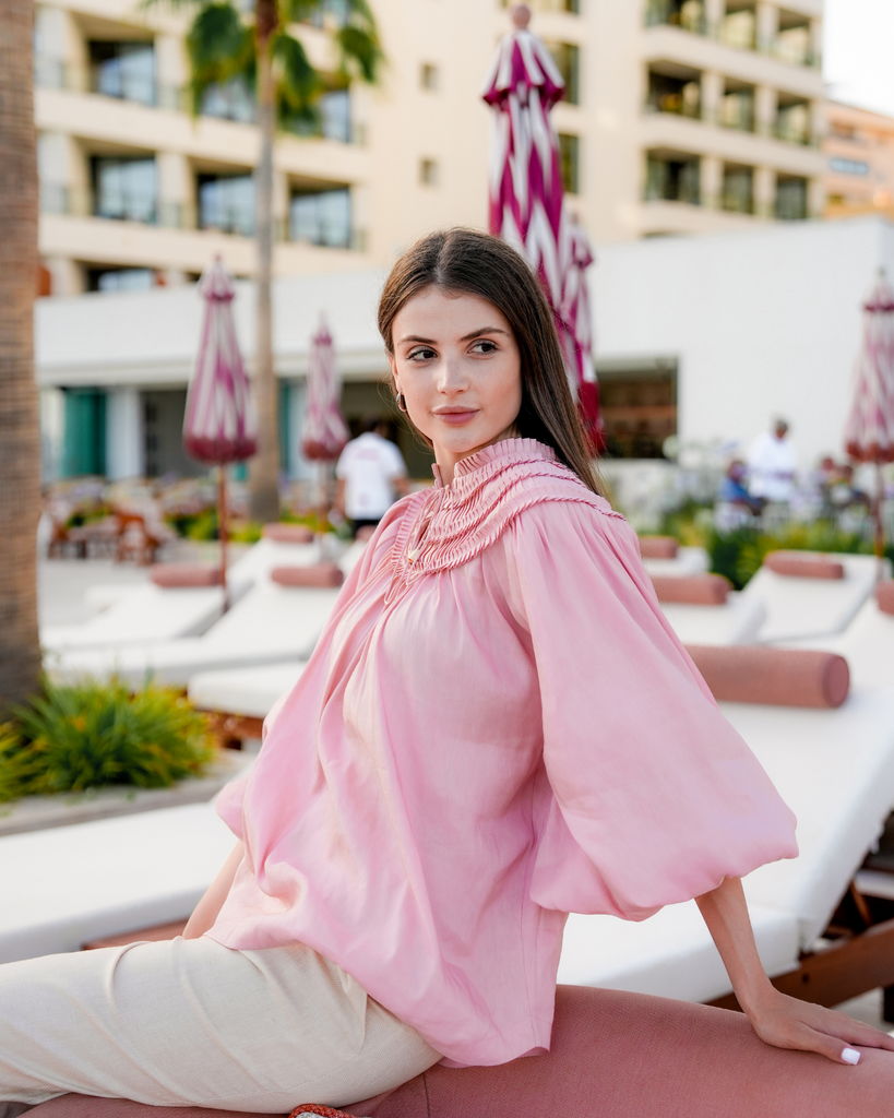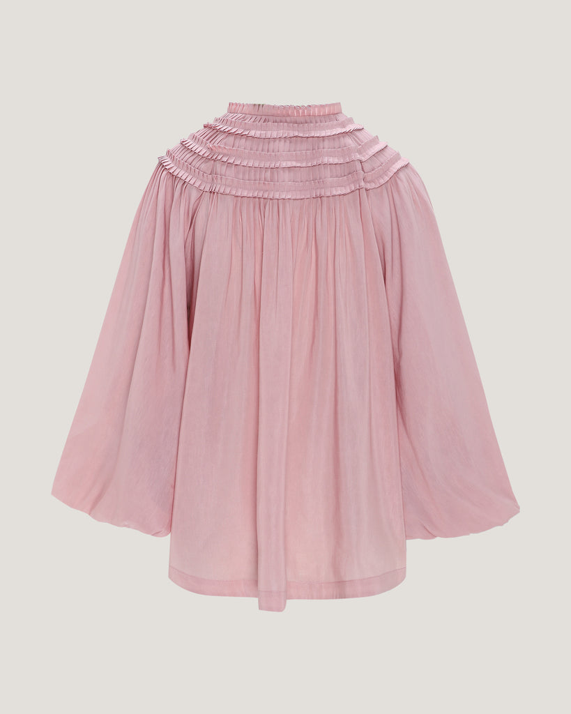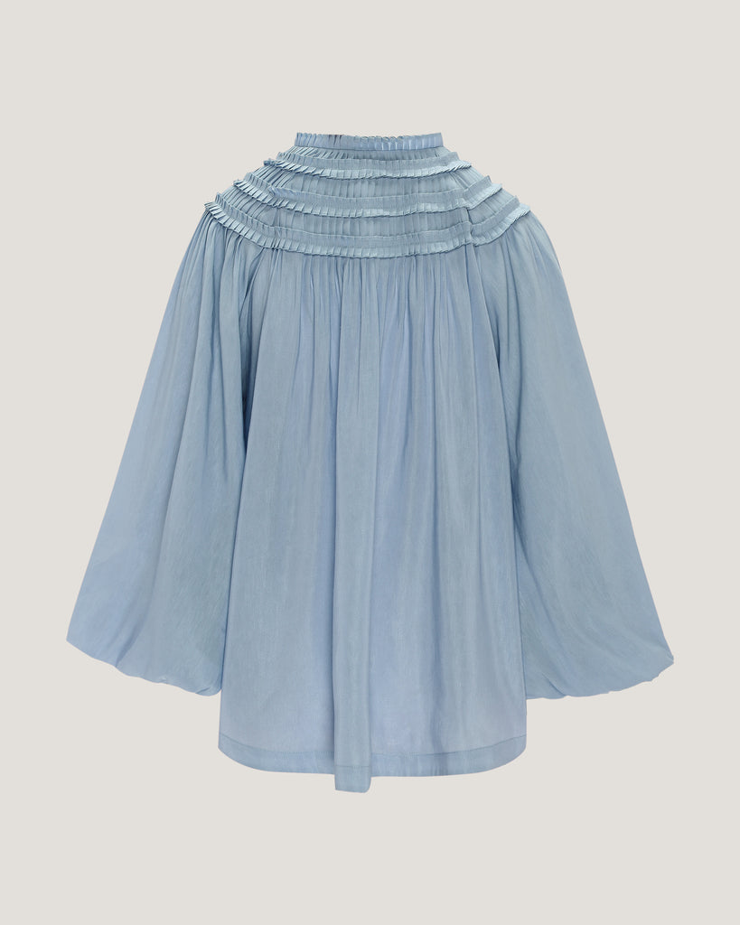 A delicate interplay of structure and softness, the Lizzie blouse captures the essence of modern femininity. The neckline, adorned with three lines of pleated ruffles, evokes a refined romance, while string loops and metal stoppers add a contemporary touch. Raglan sleeves cascade into voluminous balloon hems, lending graceful movement and subtle drama to the silhouette.