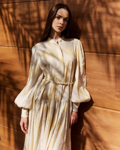 Designed with a refined band collar and concealed front placket, the silhouette is gently structured through the bodice and softly released into a flowing skirt. Voluminous long sleeves with subtle gathers add movement and grace, while the removable braided belt defines the waist with artisanal detail.