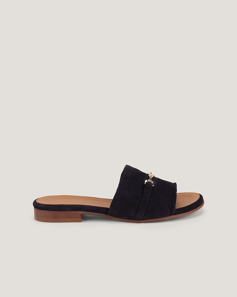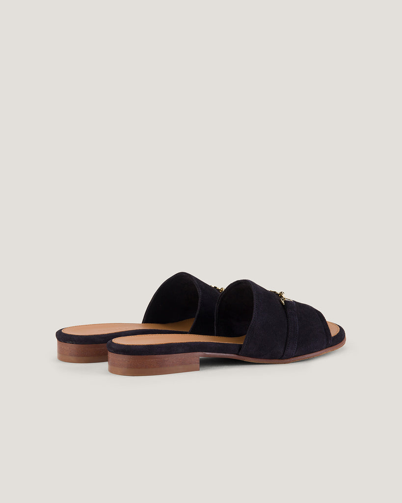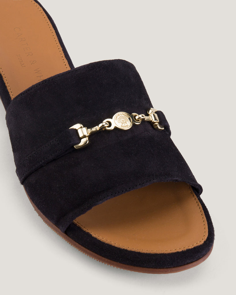 The Women Sumaya Charms Sandal in a striking Navy brings elegance and charm to any look. Crafted from soft suede, this mule-style sandal features delicate charm accents for a refined touch. The slip-on design ensures effortless wear, while the smooth texture adds to its timeless appeal. Whether paired with casual or evening ensembles, this statement piece offers both comfort and style, making it a perfect addition to any sophisticated wardrobe.