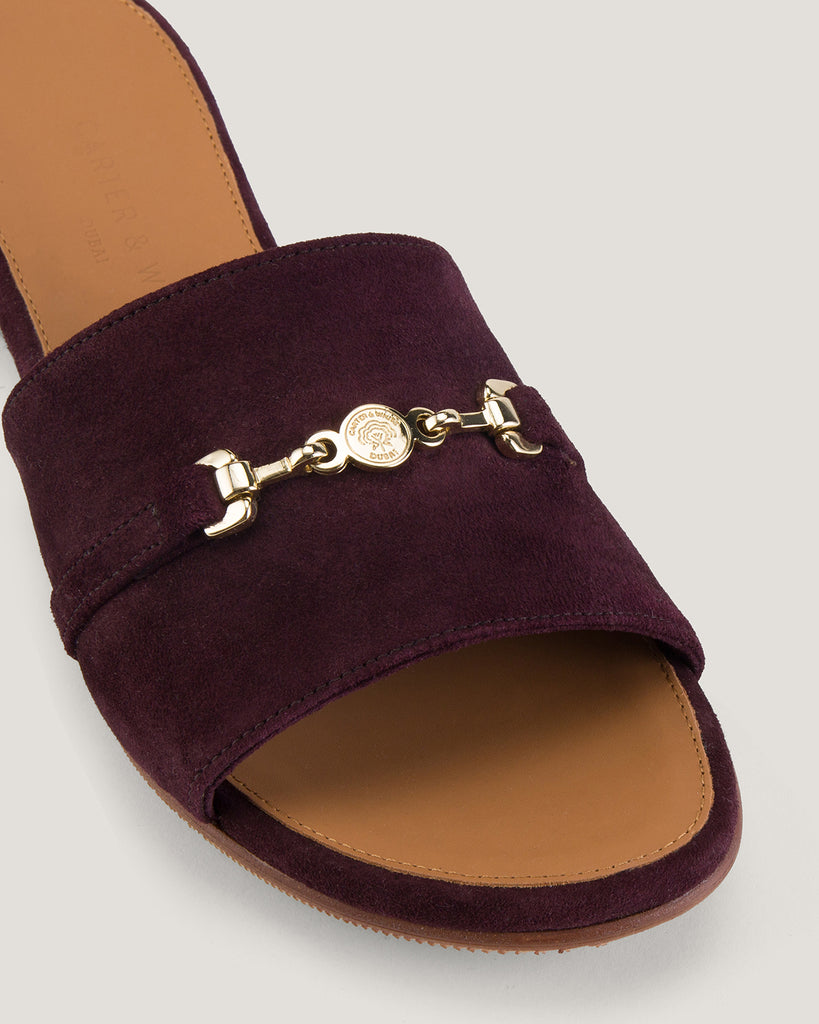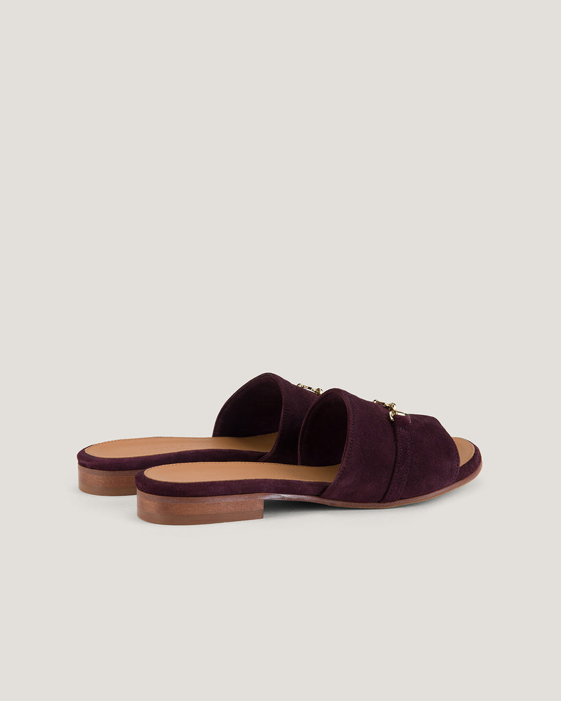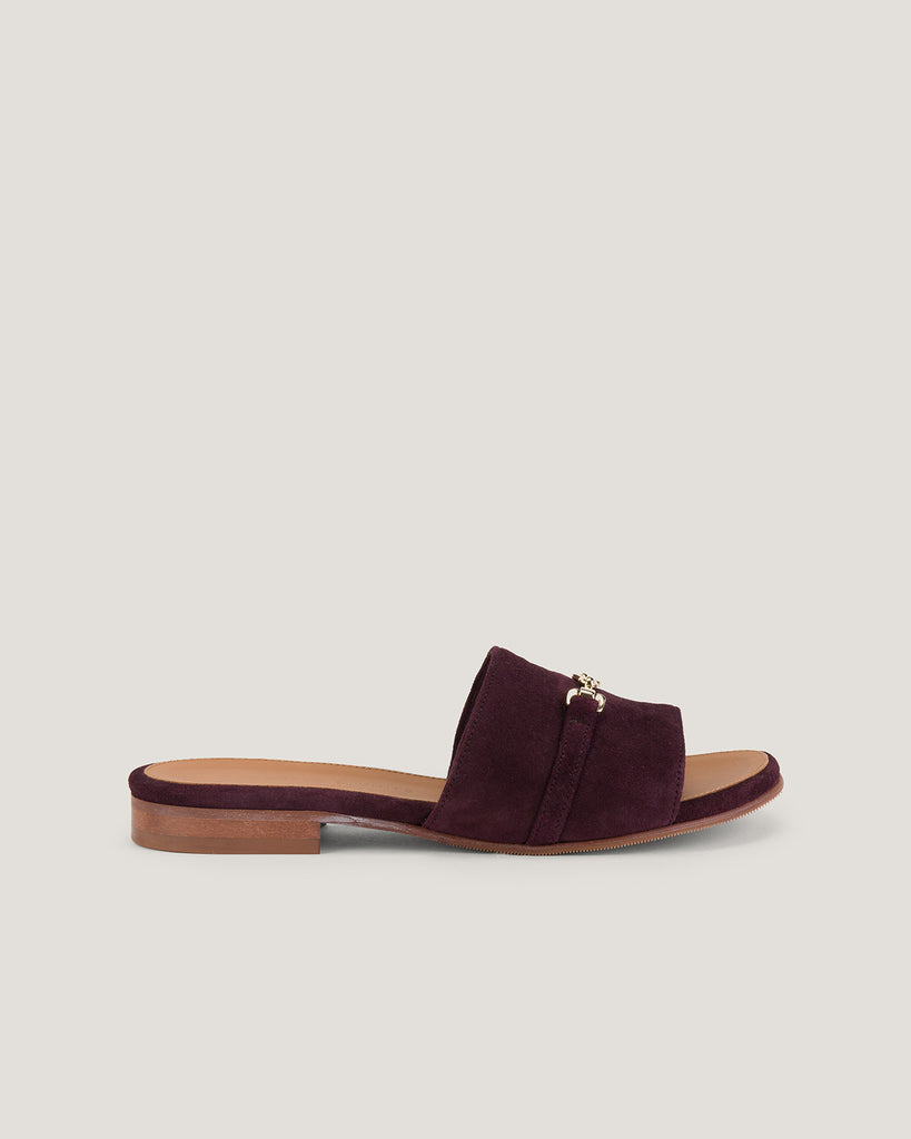 The Women Sumaya Charms Sandal in a striking winetasting brings elegance and charm to any look. Crafted from soft suede, this mule-style sandal features delicate charm accents for a refined touch. The slip-on design ensures effortless wear, while the smooth texture adds to its timeless appeal. Whether paired with casual or evening ensembles, this statement piece offers both comfort and style, making it a perfect addition to any sophisticated wardrobe.