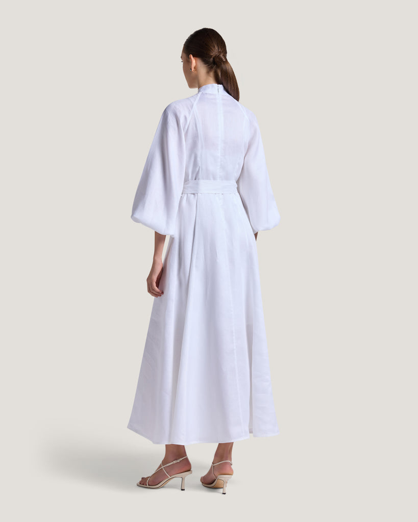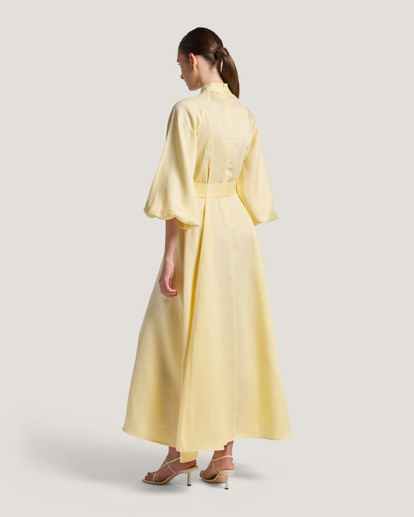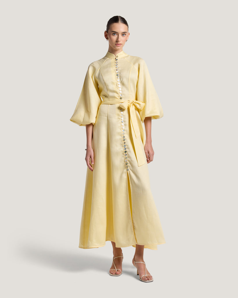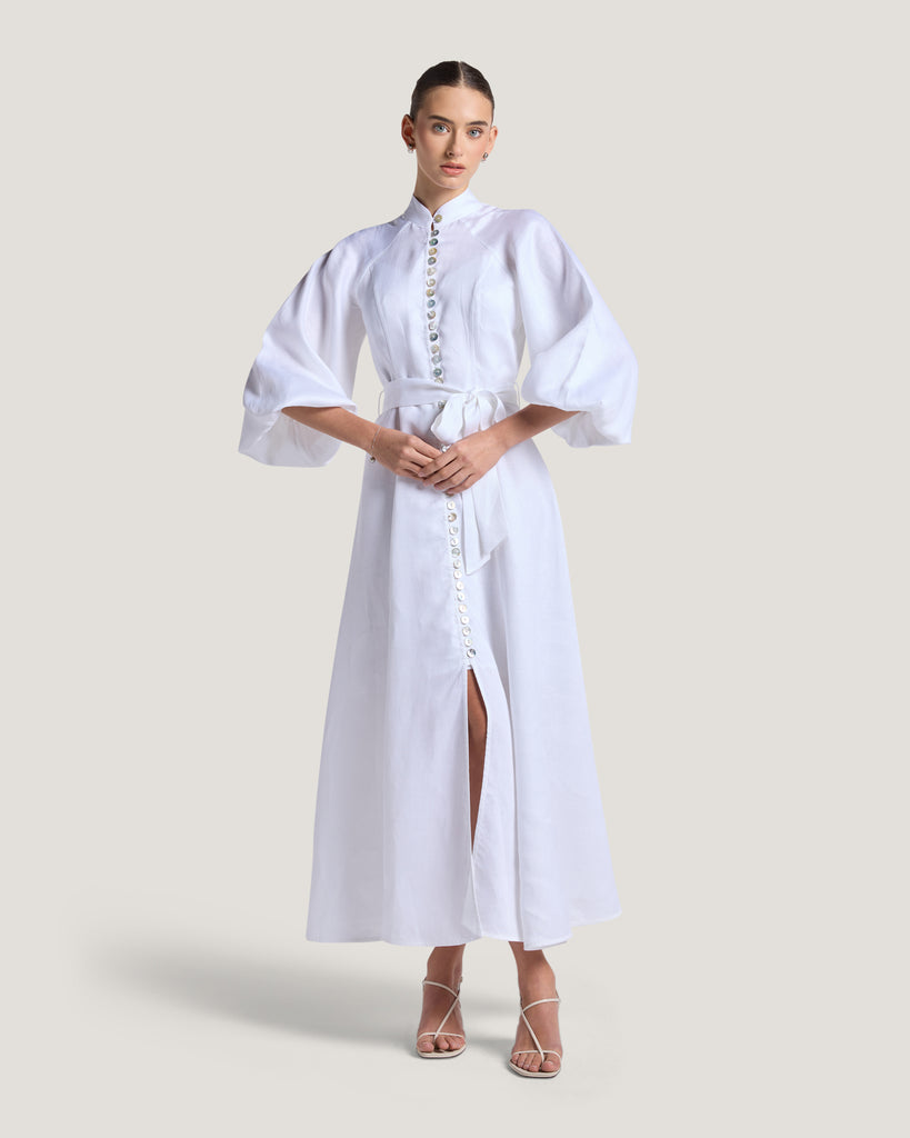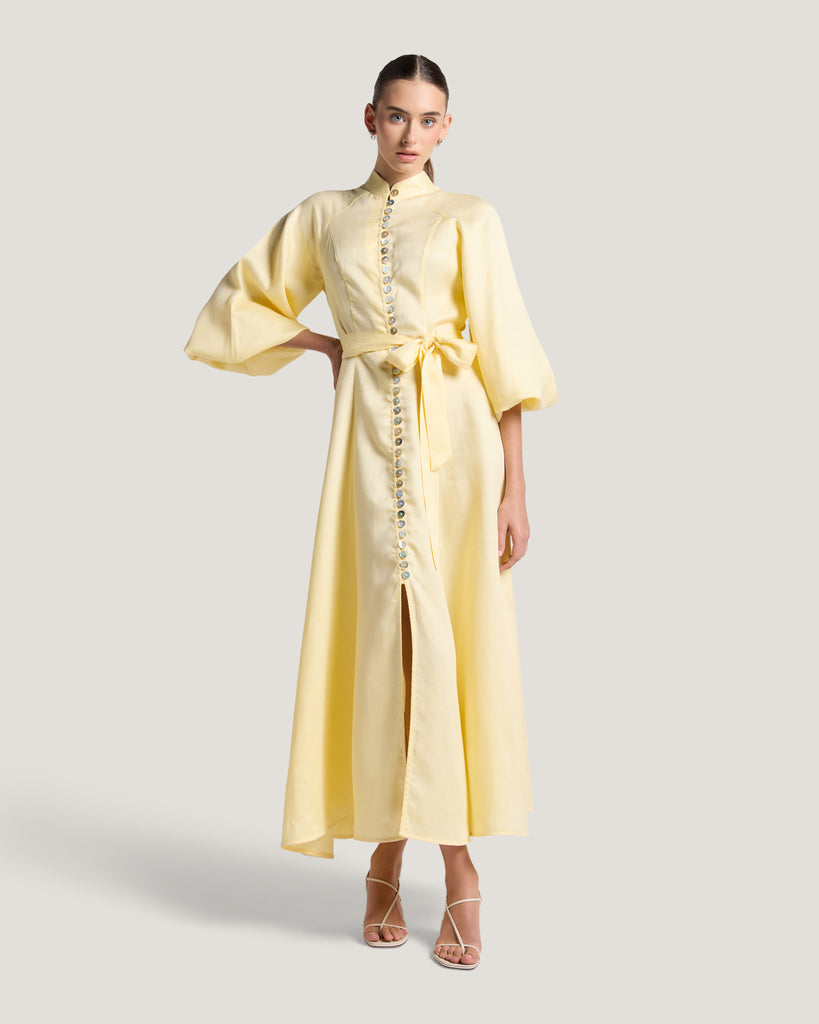 Whispers of the tropic emanate from the premium linen fabric of the Nadine Dress. Cascading gracefully in a flowing maxi length, the high mandarin collar frames the neckline with understated sophistication, while the puffed raglan sleeves add gentle volume and movement.