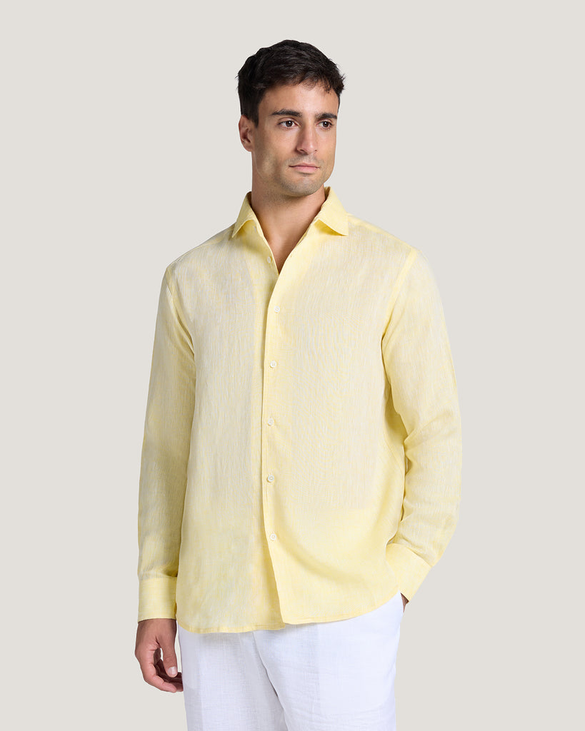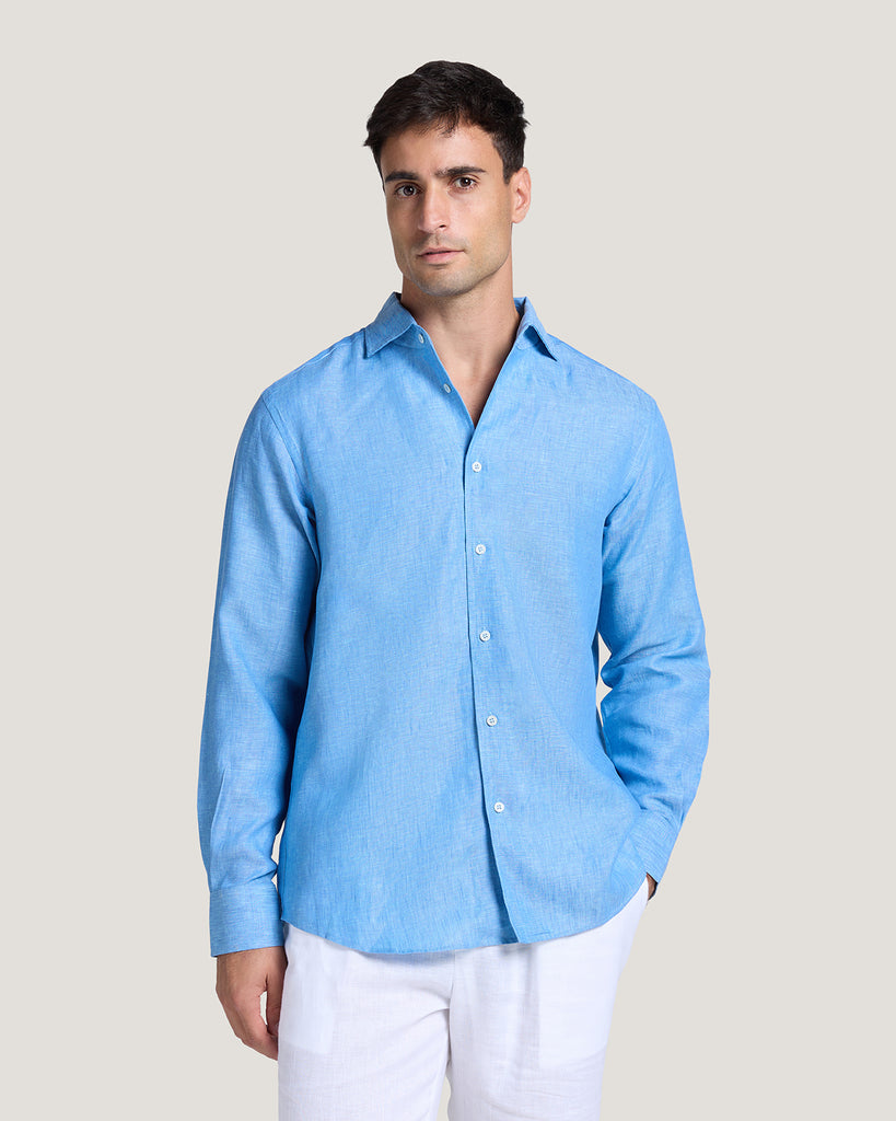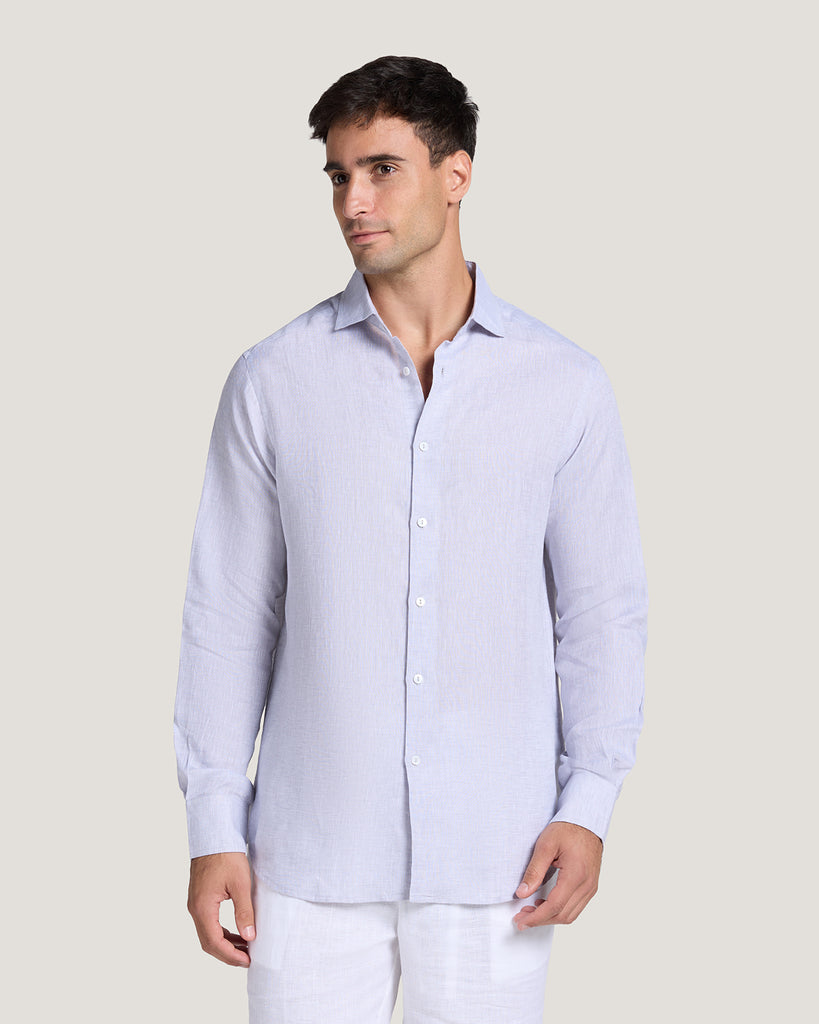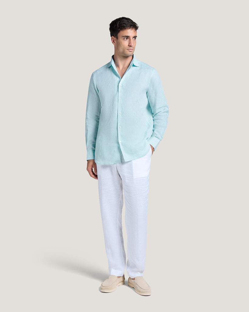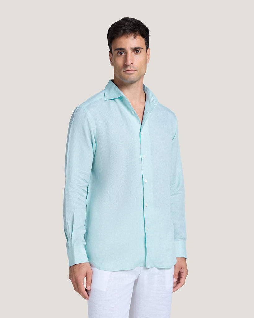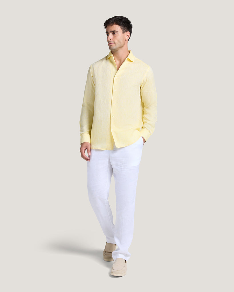 Crafted from pure linen, the Men's Carter Linen Shirt offers cool, fresh comfort that is a pleasure to wear. Its straight-fit design and long sleeves are complemented by a sharp cutaway collar with facings, ensuring a crisp, impeccable finish that maintains its elegance, even when worn open without a tie.