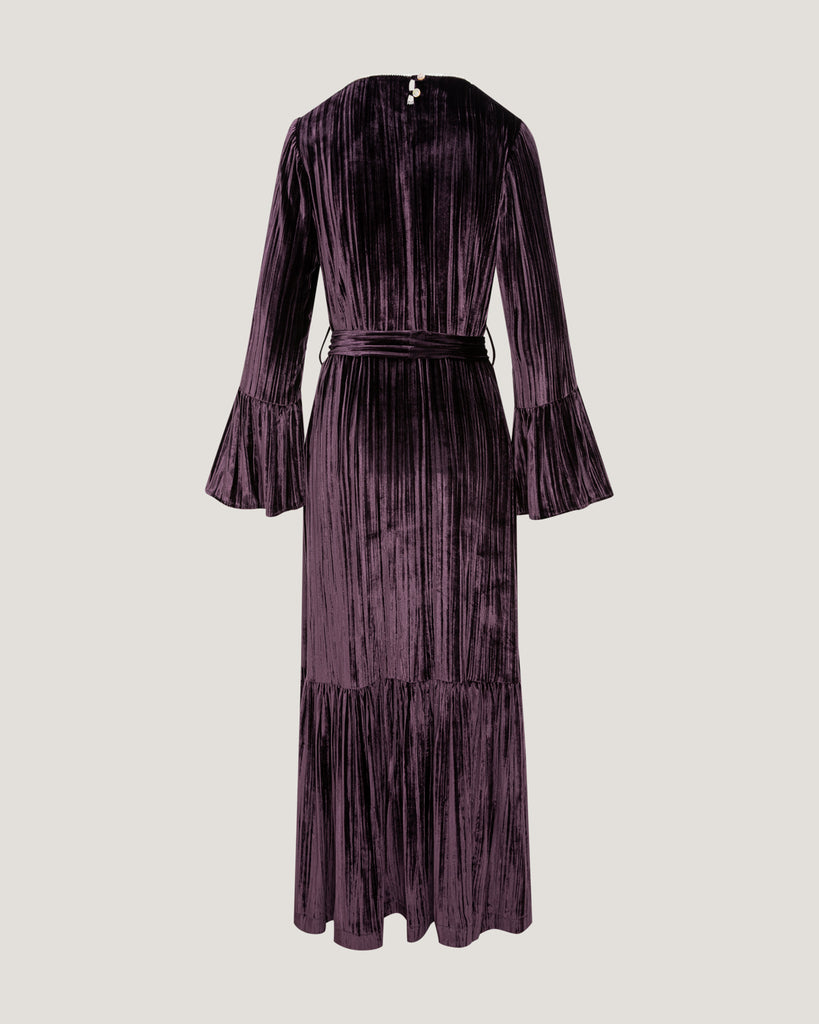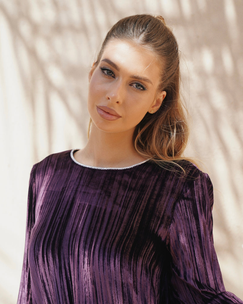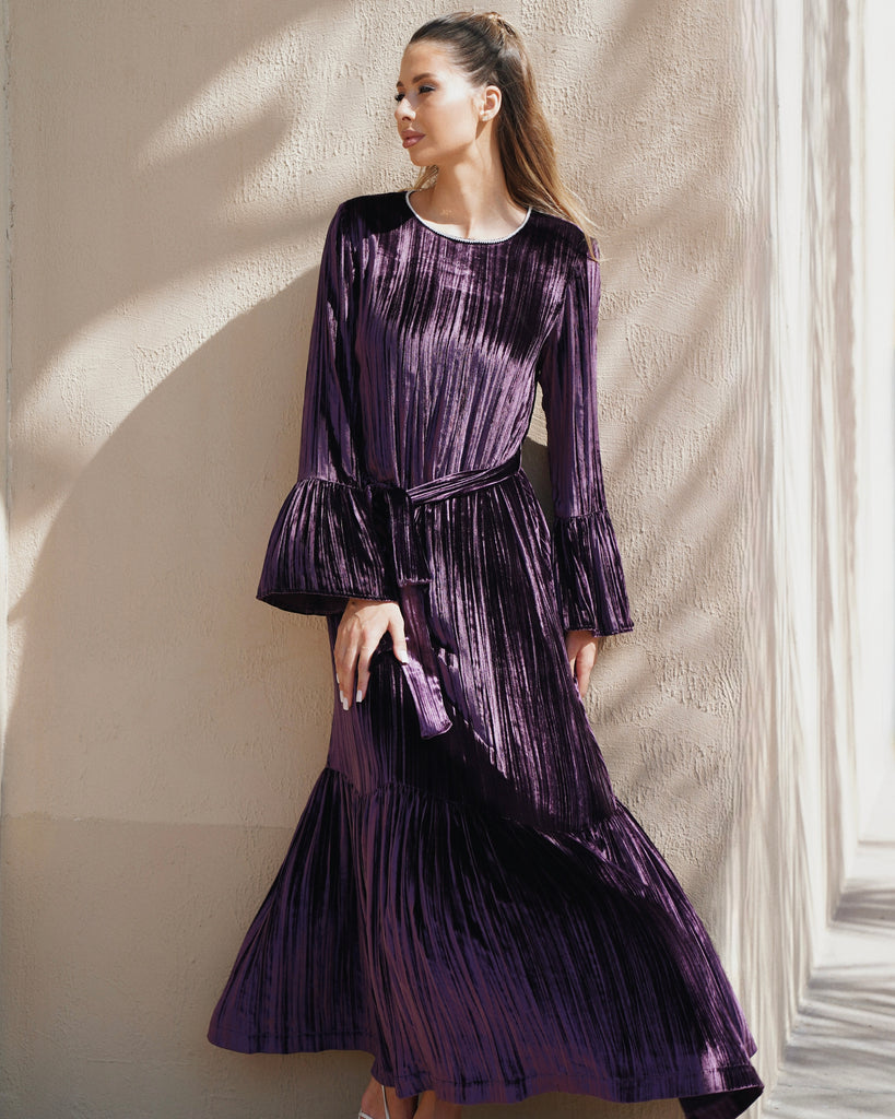 The Eriny Velvet Maxi Dress in Plum is crafted from a luxurious blend of 18% silk and 82% viscose, offering a sumptuous texture and elegant drape. Designed with a flowing silhouette that flatters the form, it exudes timeless sophistication and feminine allure. The rich plum hue enhances its refined charm, making it perfect for evening occasions. Reflecting Dubai’s contemporary luxury and international appeal, the Eriny dress embodies impeccable craftsmanship, modern grace, and effortless elegance.