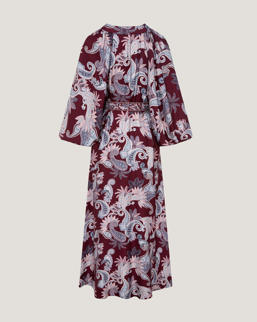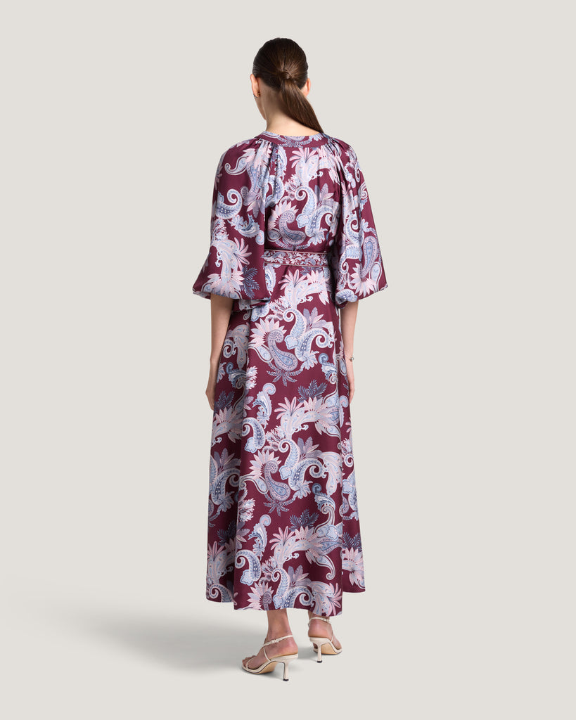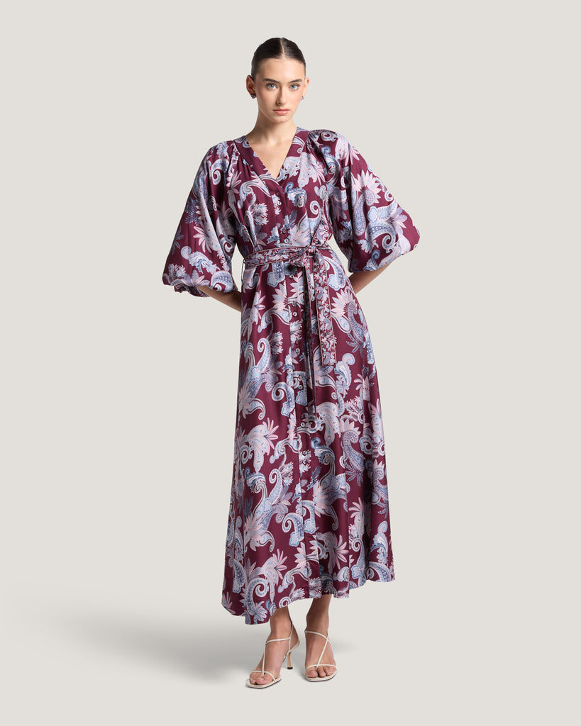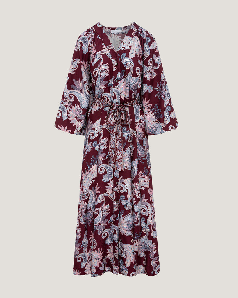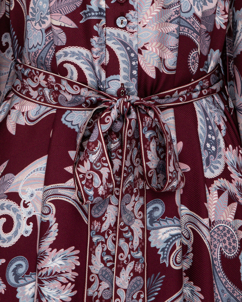 The Ivana Printed Buttoned-Down V-Neck Dress in Burgundy Paisley Print is crafted from a luxurious blend of 30% silk and 70% viscose twill, offering a soft, flowing drape and comfortable wear. Featuring a classic button-down front, a flattering V-neckline, and elegant print detailing, it exudes effortless sophistication. Perfect for both day and evening occasions, the Ivana dress embodies Dubai’s modern luxury and international style, making it a timeless piece for women who value refined craftsmanship and versatile elegance.