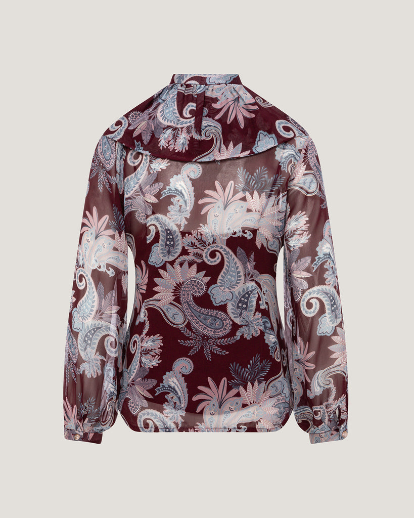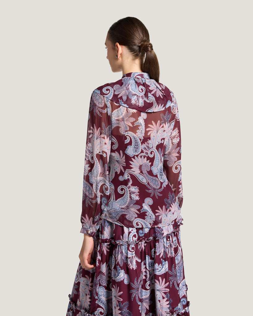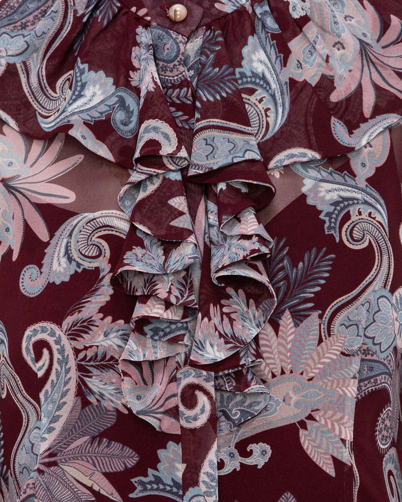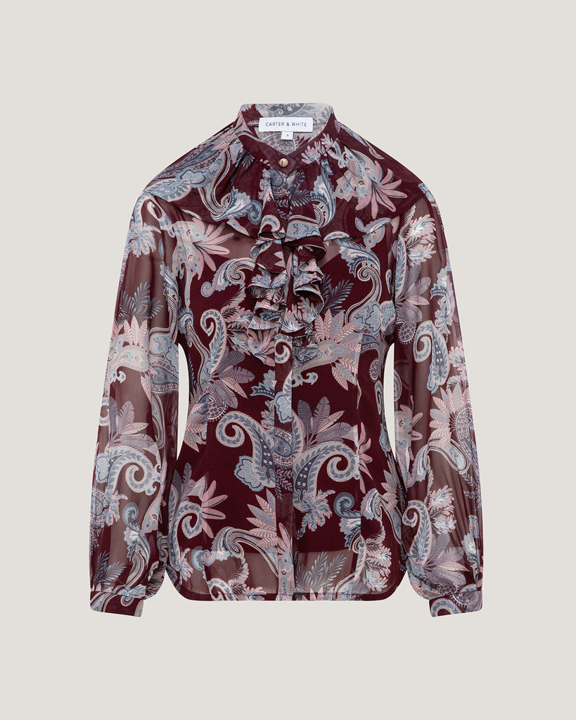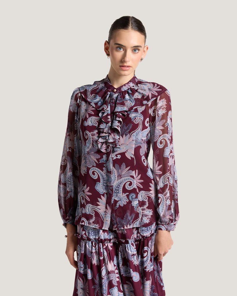 The Zahra Printed Ruffle Blouse in Burgundy Paisley Print is crafted from premium silk georgette, offering a lightweight, flowing feel with a luxurious drape. Featuring delicate ruffle accents and a refined silhouette, it combines feminine elegance with modern sophistication. Perfect for both professional and evening occasions, the blouse adds a touch of effortless style to any ensemble. Reflecting Dubai’s contemporary luxury and international appeal, the Zahra blouse is a timeless piece for women who value impeccable craftsmanship and elegance.