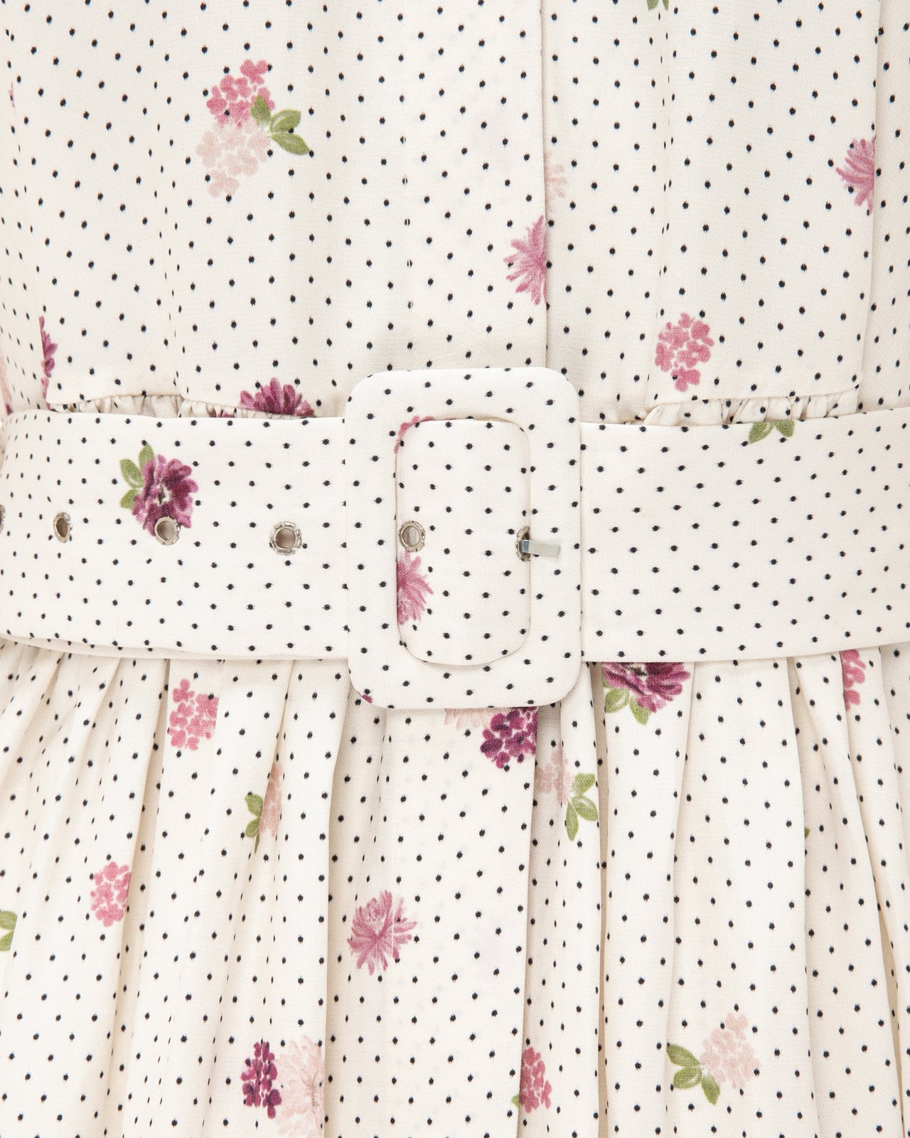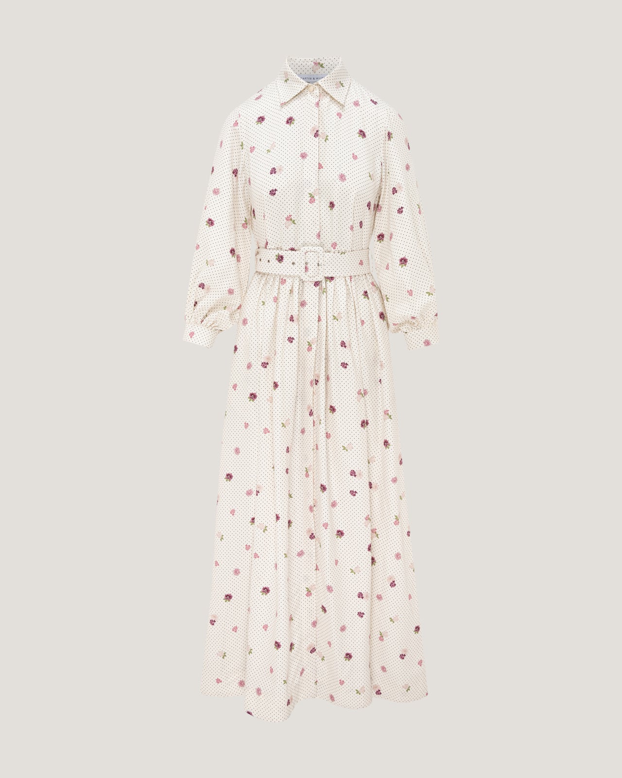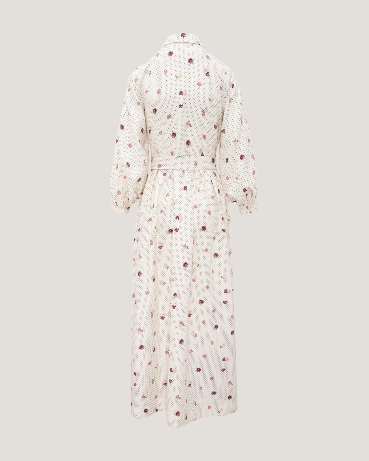 The structured classic collar and full button-down front bring tailored sophistication, while the flowing skirt adds movement and romance. A matching fabric belt cinches the waist beautifully, offering a flattering, customizable fit that enhances the natural shape. Long sleeves with subtle volume elevate the design, making it perfect for both day and evening wear.