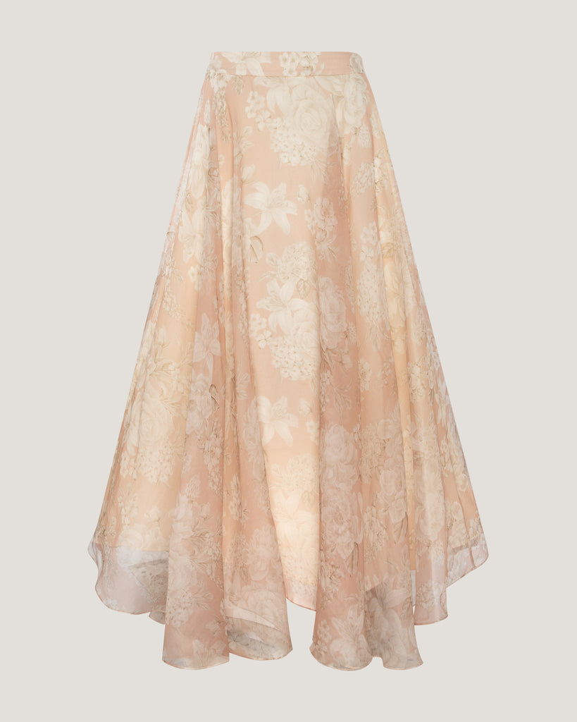 Light as air and impeccably composed, the Alaia skirt is crafted from the same sheer floral silk organza as the Ayah blouse, creating a harmonious ensemble. The waist is delicately defined, while the flared cut brings fluidity and movement to each step. Fully lined for modesty, it preserves the diaphanous charm of the fabric while offering effortless wearability. With every motion, the skirt dances softly in the breeze — a celebration of elegance in its most graceful form.