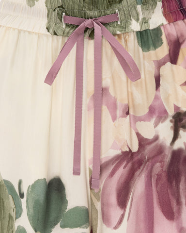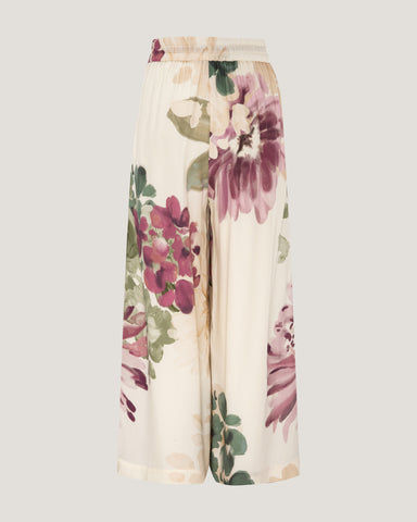 Effortlessly elegant, these wide-leg trousers are crafted from fluid silk and adorned with a painterly floral print in soft ivory, blush, and botanical green tones. The lightweight fabric drapes gracefully through the leg, creating movement and an elongated silhouette.