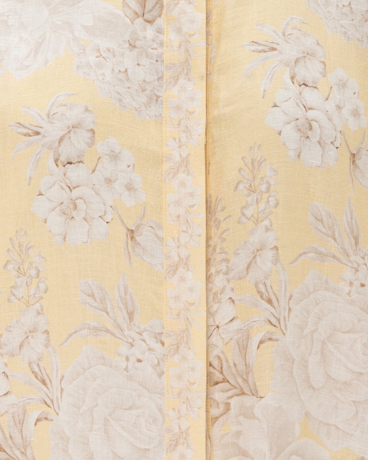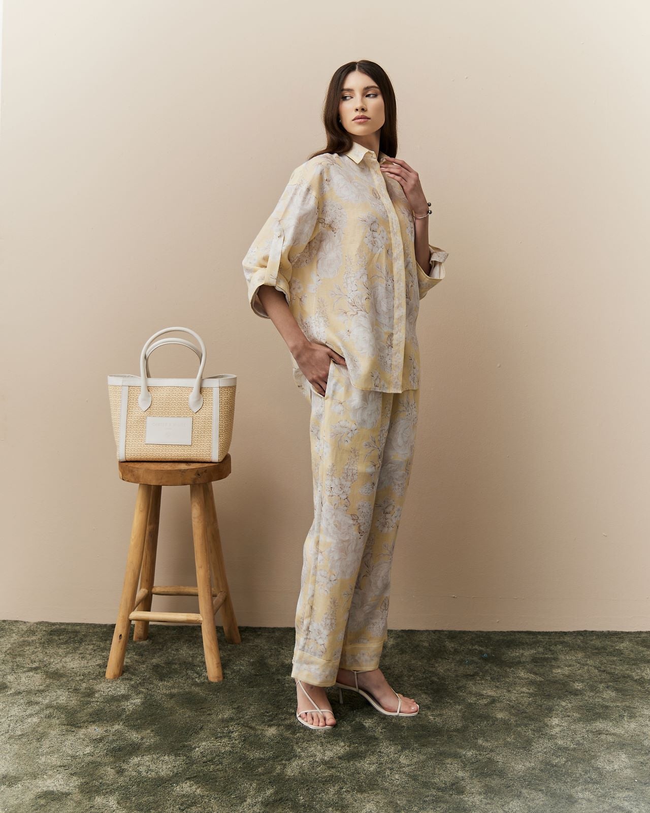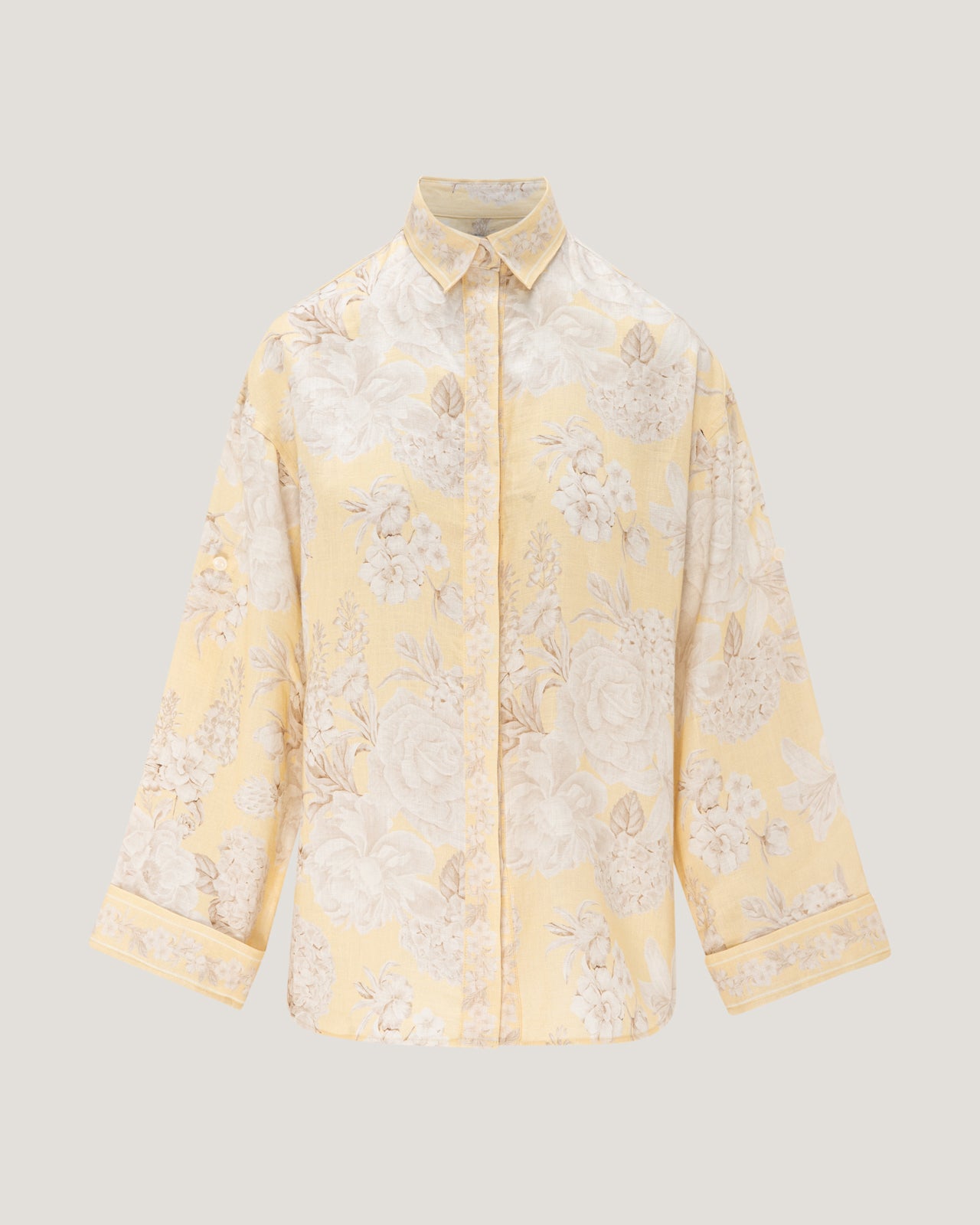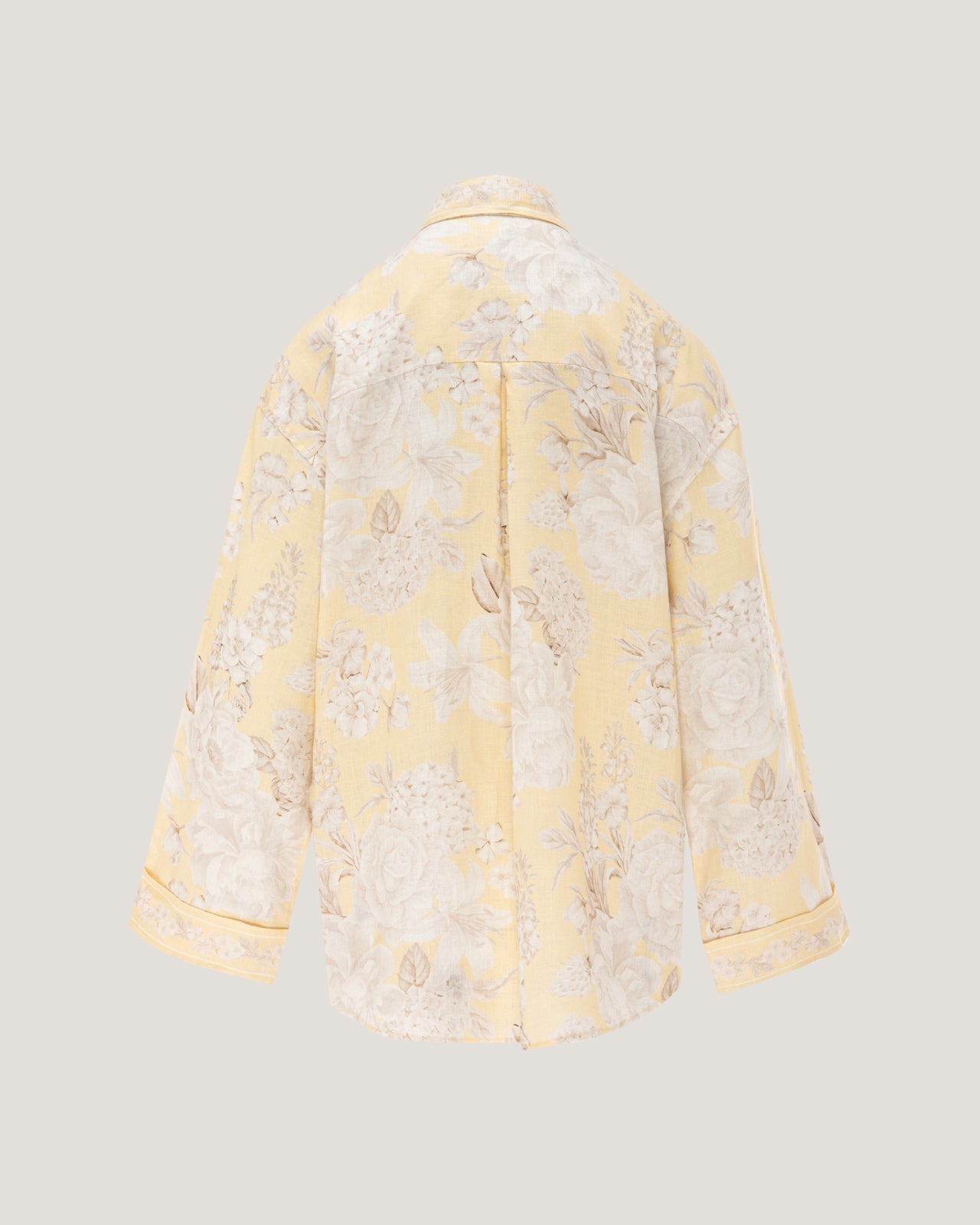 Rendered in a warm, sun-washed yellow, the design is adorned with an intricate floral motif in muted ivory and soft taupe tones, creating a subtle interplay of texture and depth. A classic point collar and concealed button placket lend a clean, polished finish, while gently dropped shoulders and wide cuffs enhance its contemporary appeal.