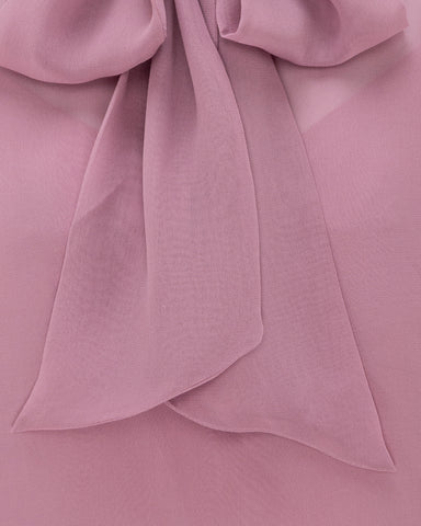 A high neckline is finished with an elongated neck tie that can be styled into a graceful bow or worn loose for understated sophistication. Voluminous sheer sleeves bring gentle movement, while wide cuffs ground the design with subtle structure. A smooth hemline ensures a clean, polished finish.