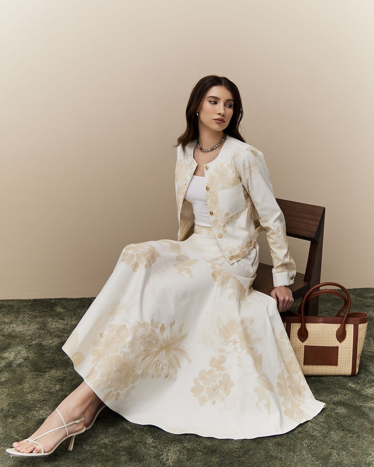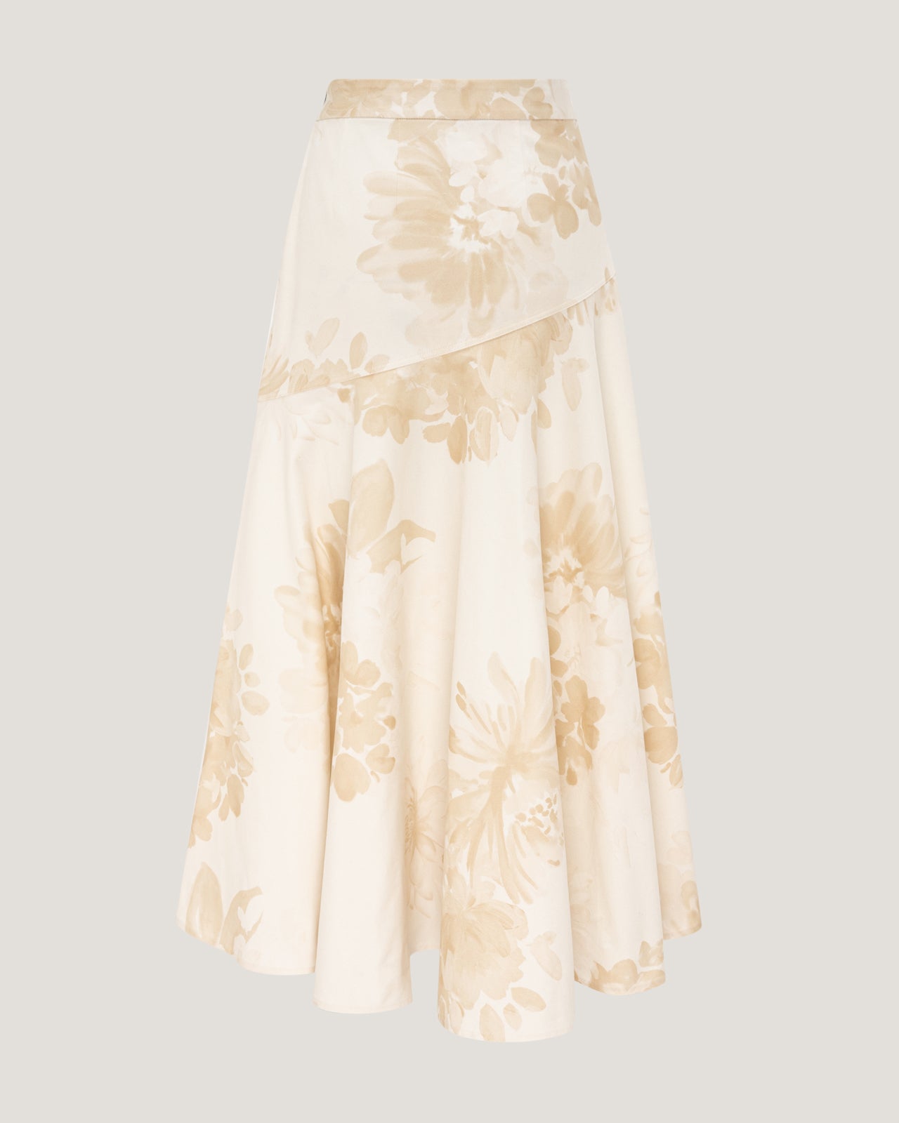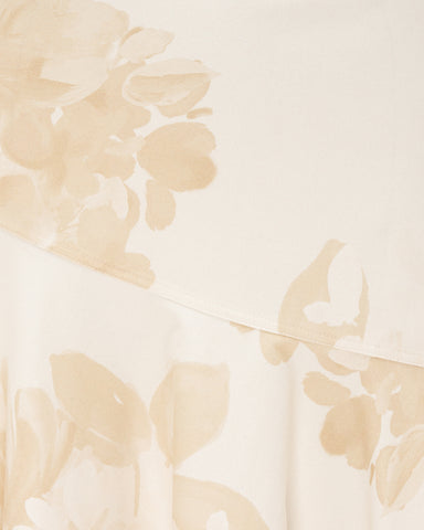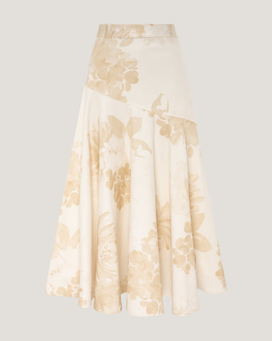 An elegant fusion of structure and fluidity, this midi skirt is crafted from premium denim and finished with a soft floral print in ivory and warm sand tones. The refined fabrication offers subtle structure while allowing the skirt to move gracefully with the body.