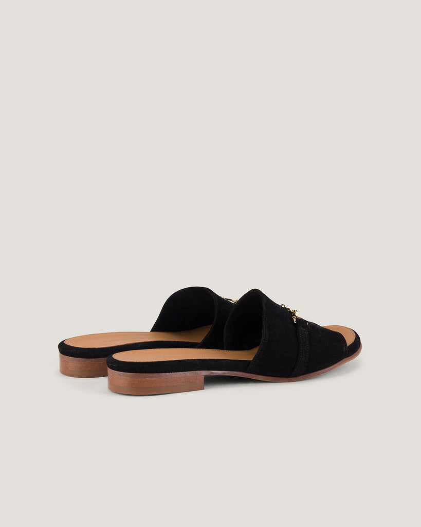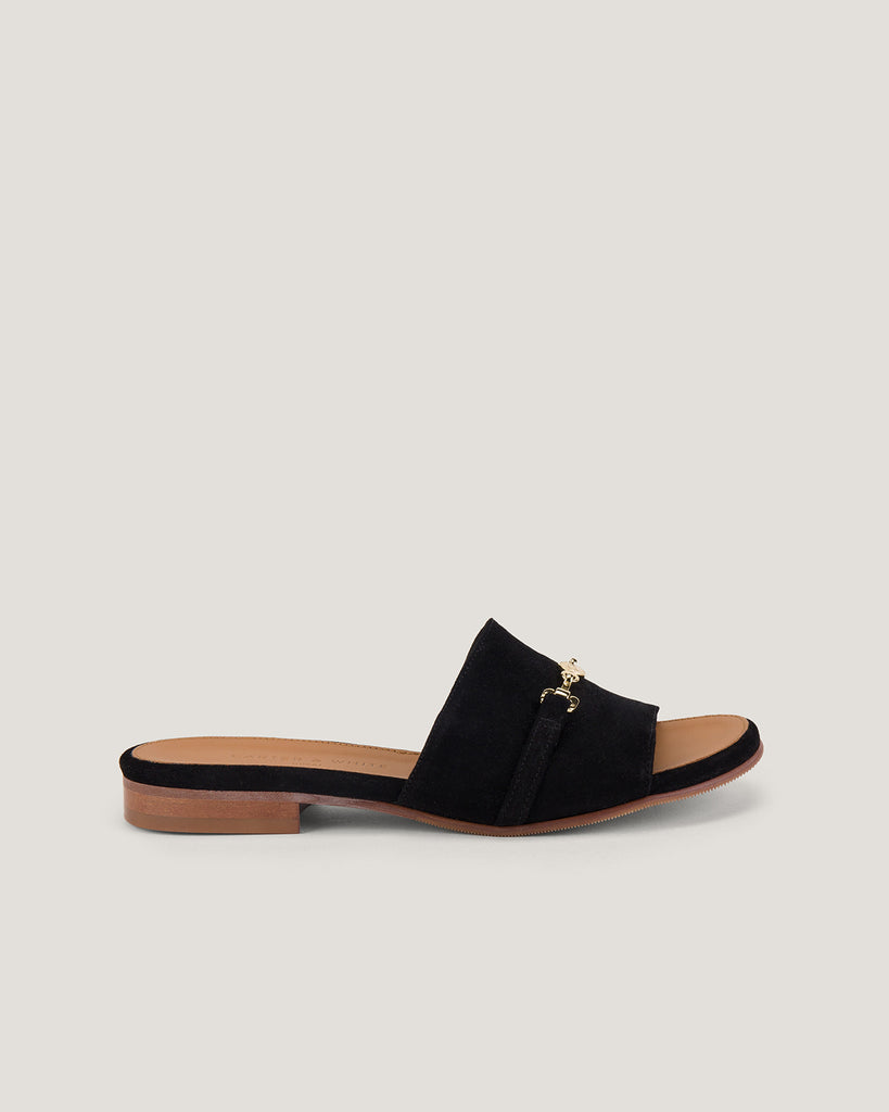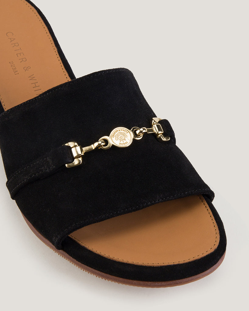 The Women Sumaya Charms Sandal in a striking black brings elegance and charm to any look. Crafted from soft suede, this mule-style sandal features delicate charm accents for a refined touch. The slip-on design ensures effortless wear, while the smooth texture adds to its timeless appeal. Whether paired with casual or evening ensembles, this statement piece offers both comfort and style, making it a perfect addition to any sophisticated wardrobe.