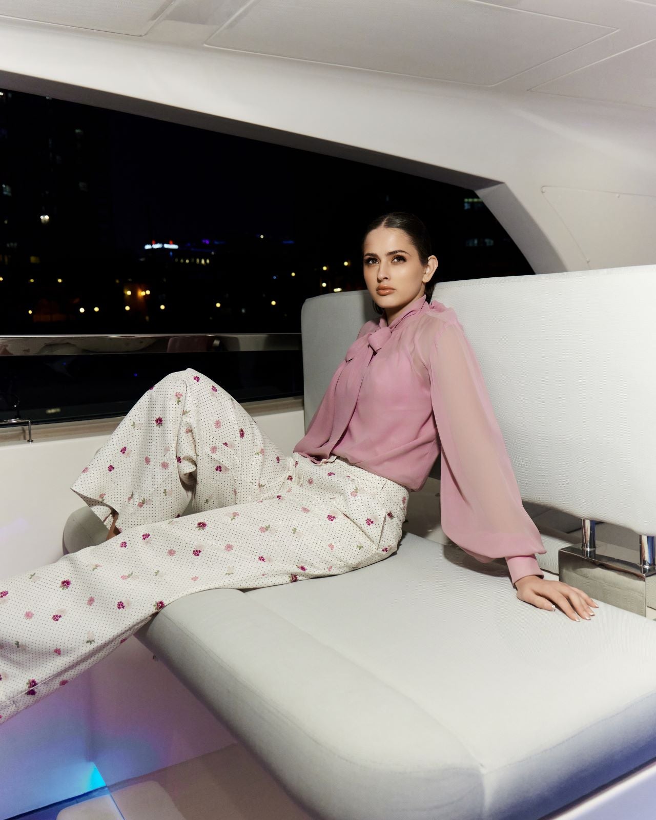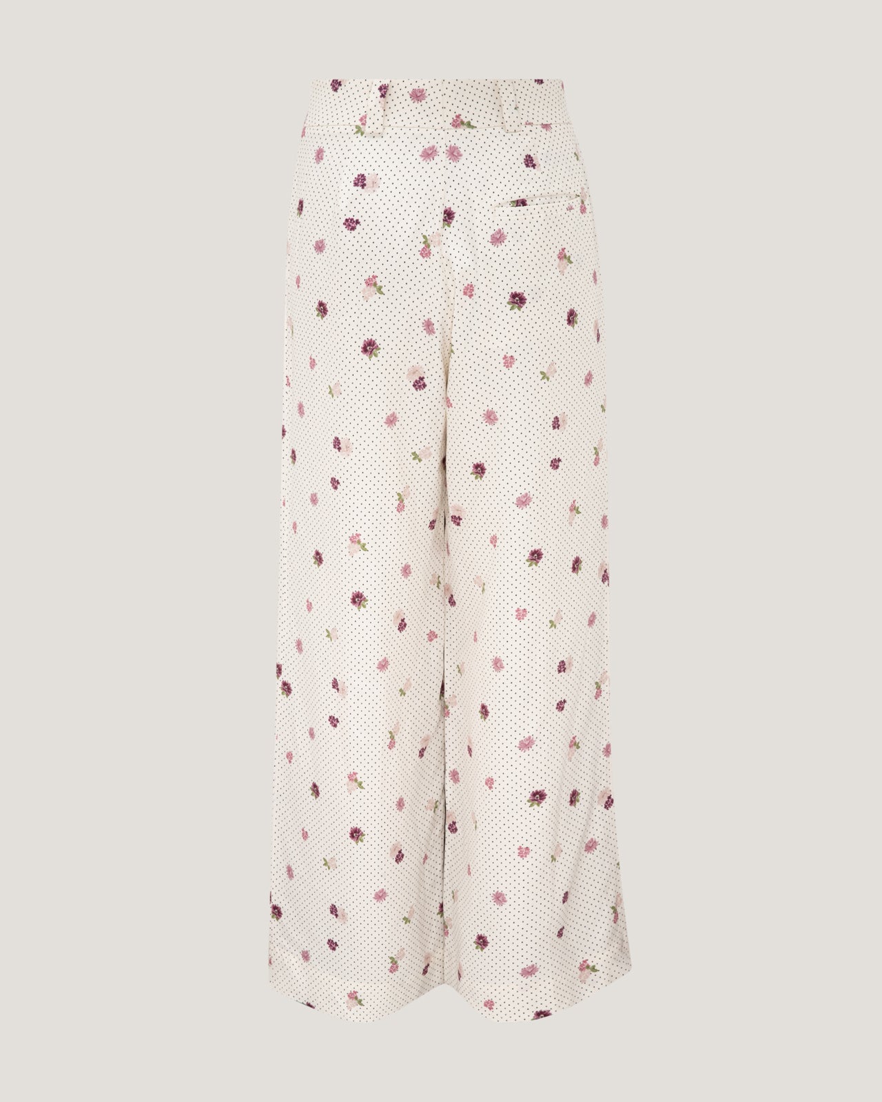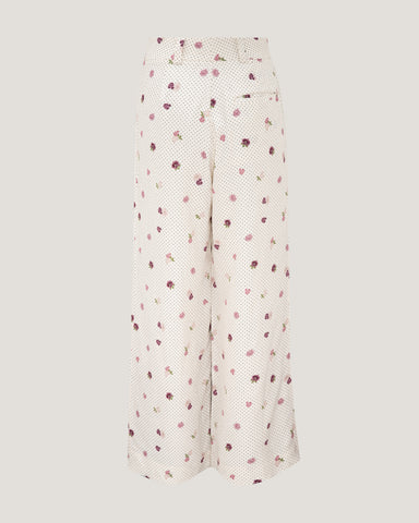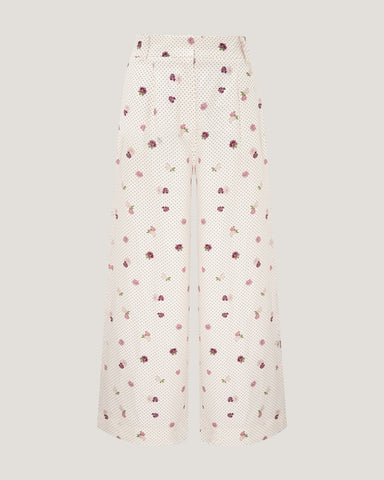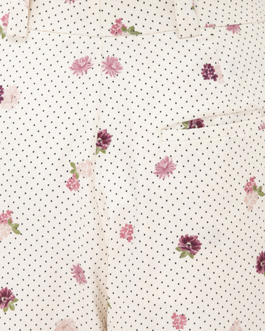 A delicate interplay of micro polka dots and scattered floral motifs lends subtle romance, while the crisp ivory base keeps the design fresh and elevated. Designed to move beautifully with the body, these trousers transition seamlessly from daytime sophistication to evening ease.