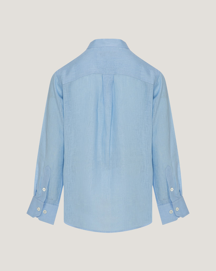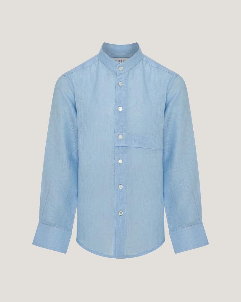 Designed for our little adventurers, the Phillip shirt brings together comfort and quiet elegance. Crafted in breathable linen and cut in a regular fit, it features refined horizontal pleats across the chest and a Mandarin collar for a modern touch. In a soft light blue hue, it offers both freedom of movement and timeless charm — perfect for active days that call for ease, and special moments that deserve a little extra polish.