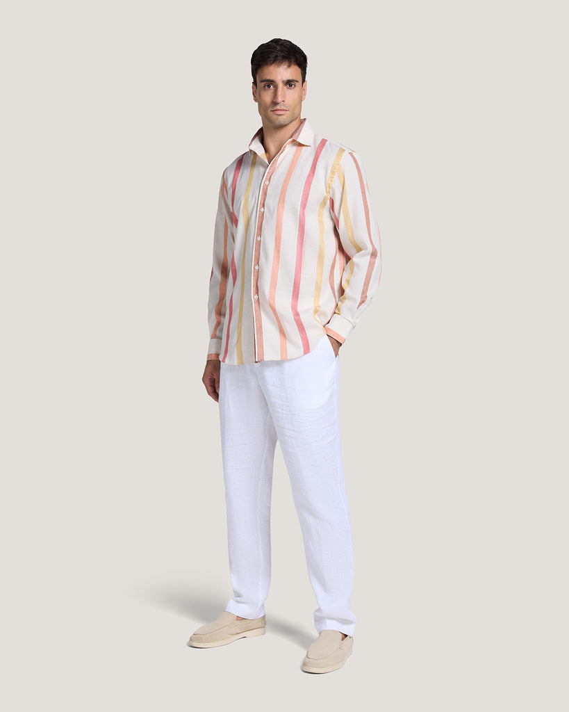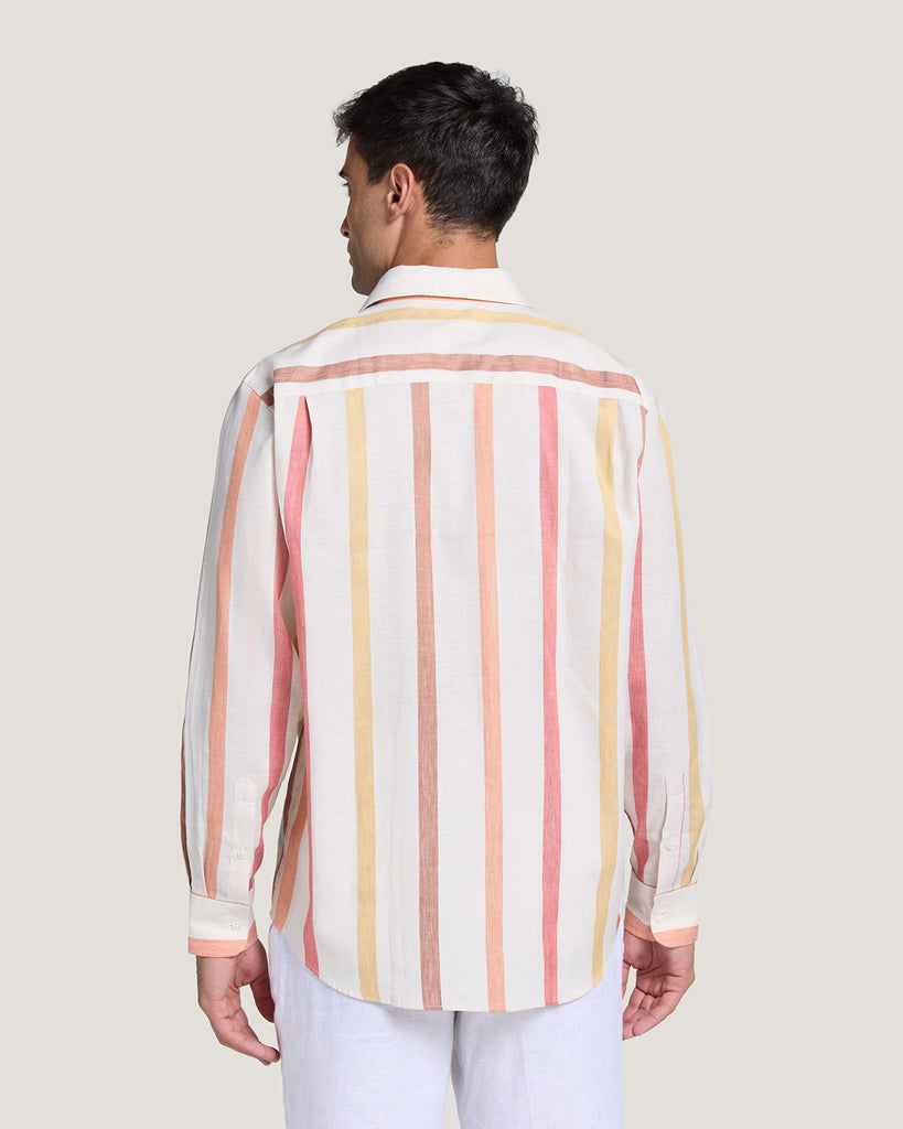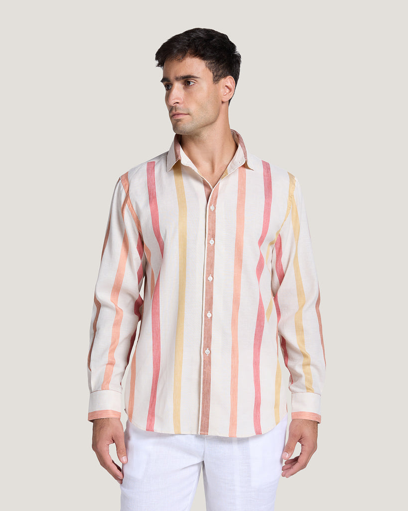 A harmonious blend of design and craftsmanship, the Men's Carter Shirt redefines classic shirting with its refined details. Crafted from a breathable blend of linen and cotton, this straight-fit, long-sleeve shirt features a cutaway collar for a sharp, modern edge. The striped fabric plays with contrast, showcasing horizontal stripes on the yoke and vertical stripes on the body, creating a visually striking yet sophisticated look.