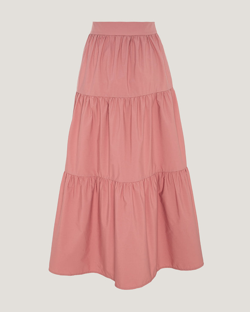 The Judith skirt in powder rose is crafted from crisp 100% cotton and designed with three tiers of soft ruffles, creating an elongating visual effect that subtly enhances the silhouette. The fitted waistband cinches gently at the waist, offering structure while allowing the volume of the skirt to move with lightness and ease. Worn with its matching top, it creates a harmonious ensemble — effortlessly feminine and refined, in true Carter & White spirit.